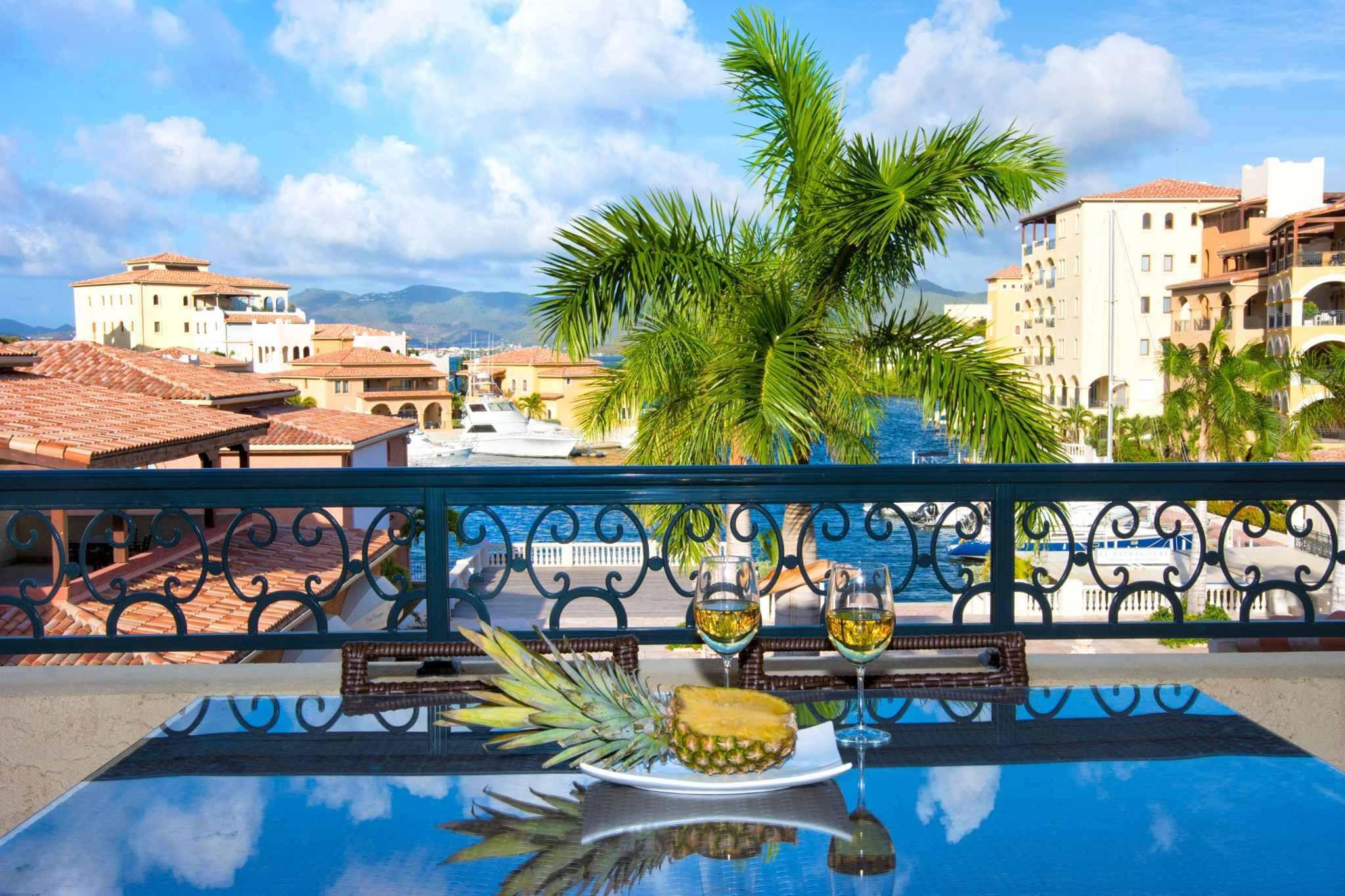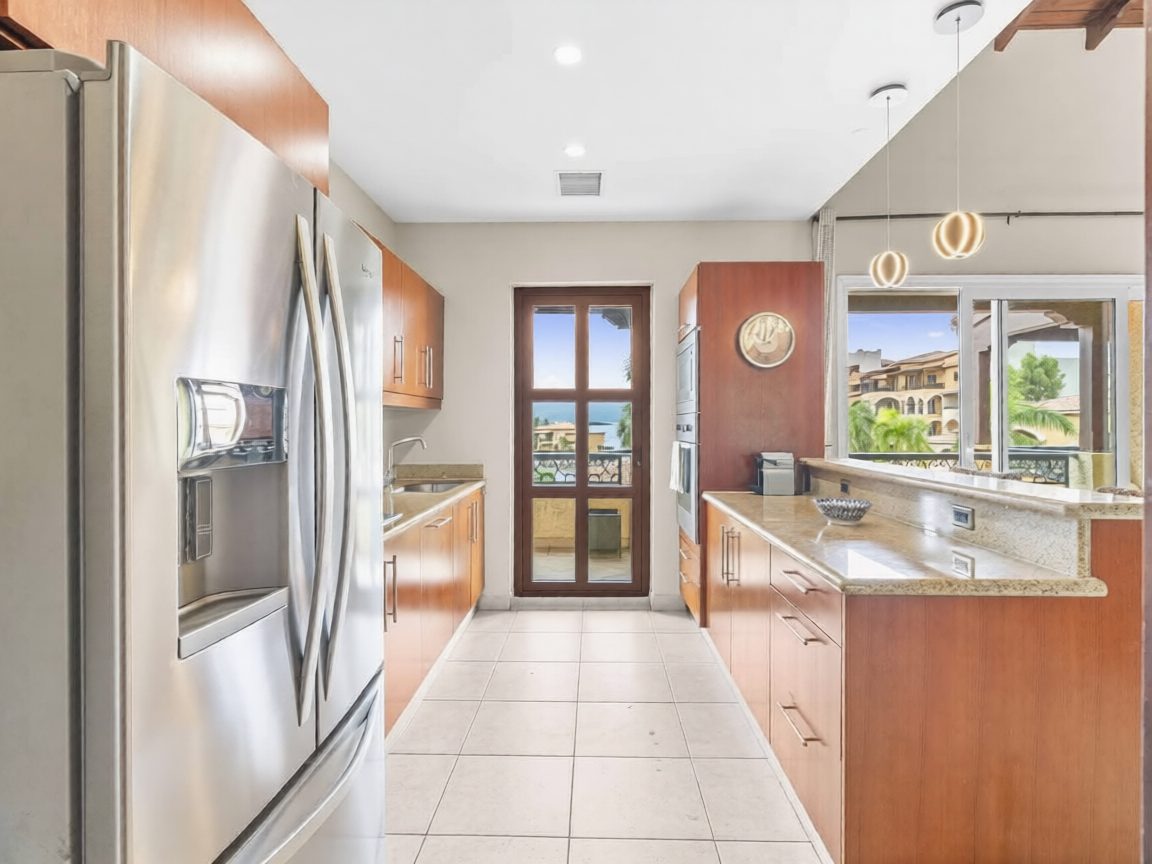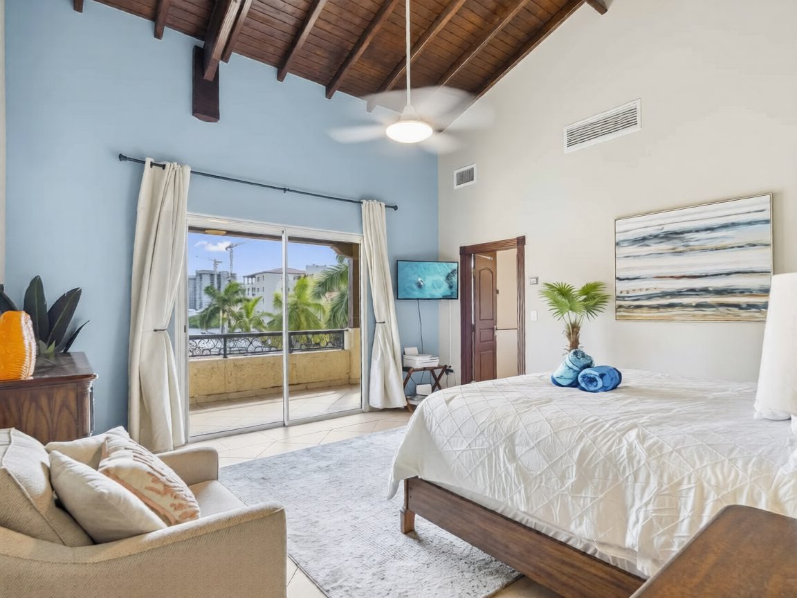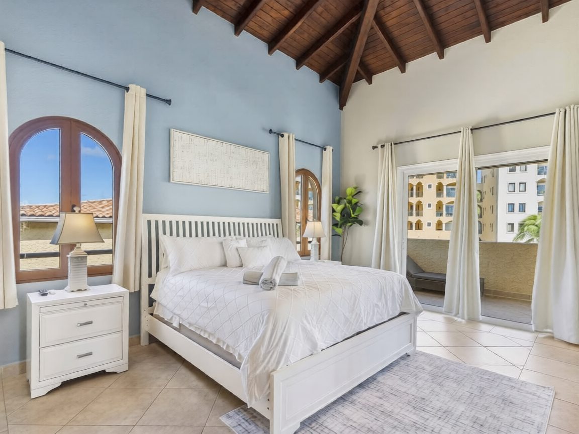 - Two additional guest bedrooms, each with private balconies, ample closet space, and en-suite marble bathrooms with mahogany vanities