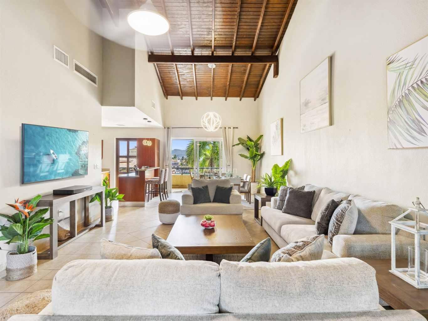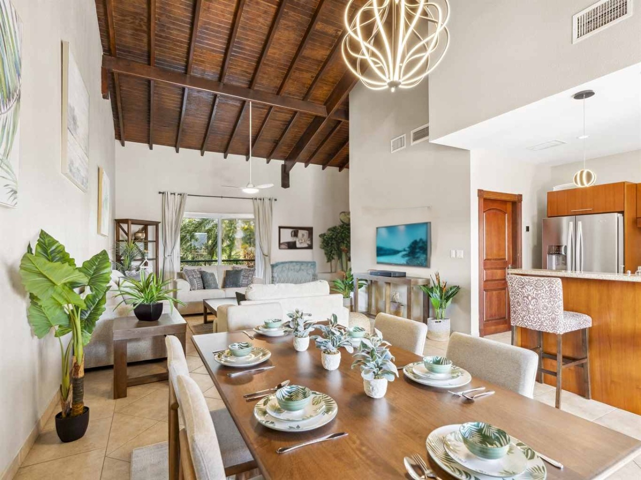 - Open-concept living and kitchen area with vaulted wood-beamed ceilings